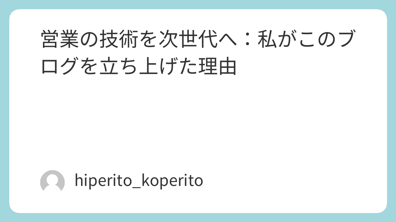 営業は、時に「御用聞き」や「お願い営業」と揶揄されることもあります。しかし、本来の営業とは、人々の課題を解決し、新しい価値を届ける非常にクリエイティブで尊敬されるべき仕事です。私が培った技術を言語化することで、営業職の皆さんが自分の仕事に誇りを持てる一助になりたいと考えています。